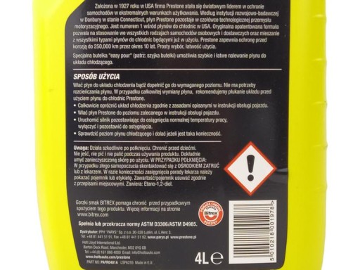 Dodatkowo Płyn do chłodnic Prestone może być bezproblemowo mieszany z każdym innym płynem na bazie glikolu etylenowego nie zmieniając jego właściwości ochronnych i koloru.