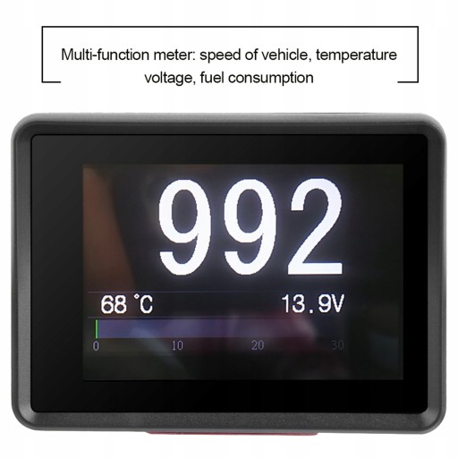 Cechy: 1. Miernik wielofunkcyjny: prędkość pojazdu, temperatura, napięcie, zużycie paliwa. 2. Alarm temperatury wody, ostrzeżenie o przekroczeniu prędkości i usterce, wygodne dla właścicieli samochodów. 3. Projekt instalacji interfejsu OBD, plug and play, bez konieczności niszczenia przewodu. 4. Potrafi zeskanować i wyczyścić kod błędu, zmniejszyć koszty konserwacji. 5. Wykonany z ABS, trwały do długotrwałego użytkowania.