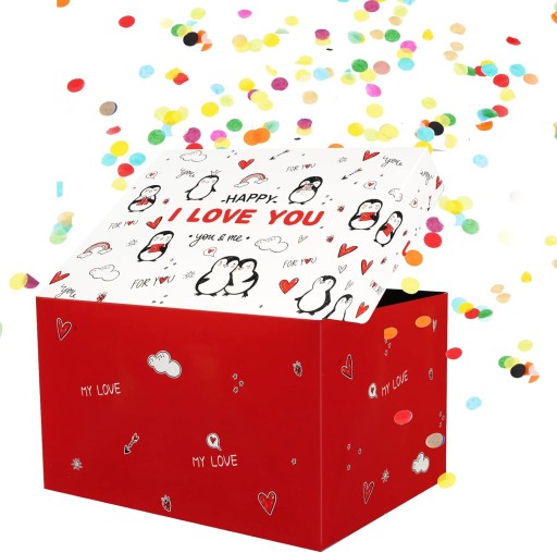 - Dzięki mechanizmowi "wybuchu", pudełko otwiera się efektownie, uwalniając konfetti i dodając radości oraz uśmiechu osobie obdarowanej.