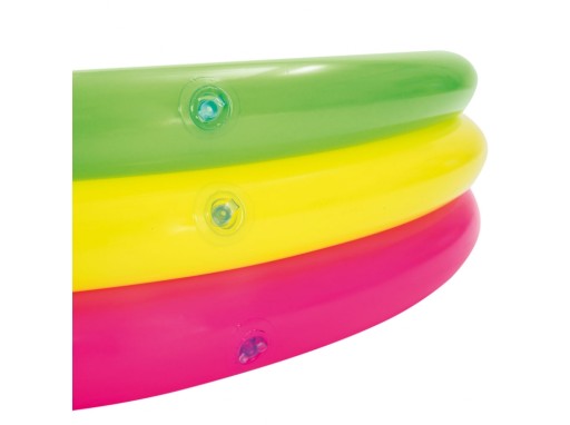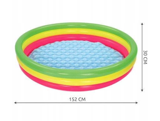 Basen kolorowy [51103] Specyfikacja - 3 dmuchane komory, - miękka dmuchana podłoga, - zalecane napełnienie: 211 l, - wytrzymałe, łatwe w obsłudze zawory. Dane Techniczne Wymiary 152 x 30 cm Grubość ścianki winylowej 0,19 mm Waga 1,9 kg Wyposażenie zestawu - basen, - łatka naprawcza, - kolorowe pudełko.