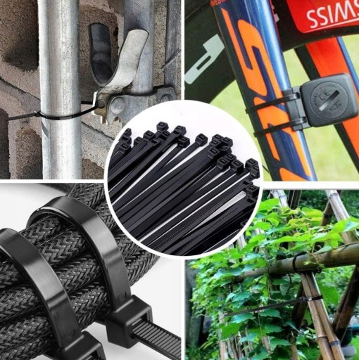 Zestaw obejmuje opaski zaciskowe w różnych długościach, co pozwala na elastyczność i dopasowanie do konkretnych potrzeb.