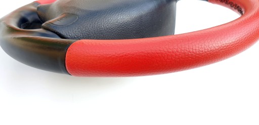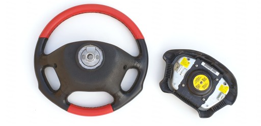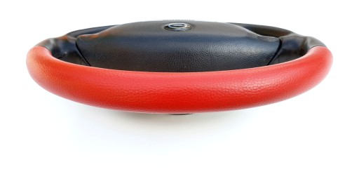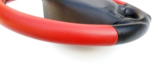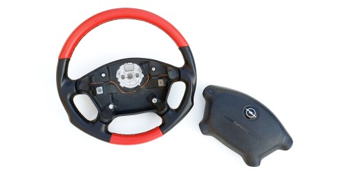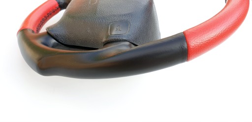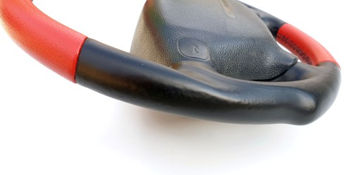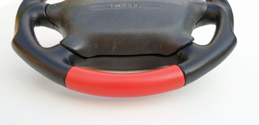 Przedmiotem ogłoszenia jest kierownica z poduszką firmy Irmscher. Wersja AB7 po "modyfikacjach" - górna i dolna część została obszyta chyba sztuczną skórą w czerwonym kolorze.