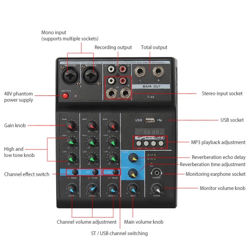 4-kanałowy wielofunkcyjny mikser: z regulacją wzmocnienia, regulacją wysokich i niskich tonów, regulacją opóźnienia pogłosu, wydajność strojenia miksera jest duża.