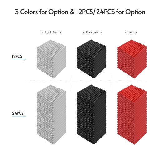 Wysokiej jakości akustyczne panele piankowe, wymiary 30 * 30 * 2,5 cm / 12 * 12 * 1 cala, opakowanie 12 sztuk lub 24 sztuki dla opcji i 3 kolory (ciemnoszary / jasnoszary / czerwony) do wyboru.