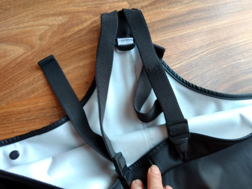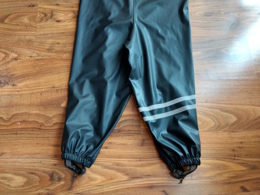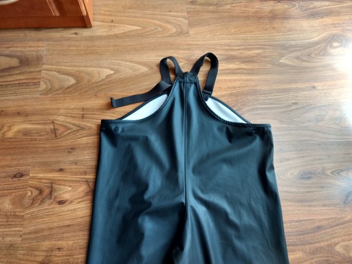 czarne nieprzemakalne przeciwdeszczowe i przeciwśniegowe spodnie na regulowanych szelkach z gumy z klamrami zatrzaskowymi w pasie po bokach napy regulujące szerokość dół nogawek ściągany gumą dodatkowo gumy na buty ogólnie stan bdb- jedynie ślady użytkowania widoczne na gumkach na buty oraz na paskach odblasowych wymiary szer w pasie max-46 cm szer po zapięciu nap -36 cm dł bez szelek-86 cm dł nogawki od kroku-52 cm