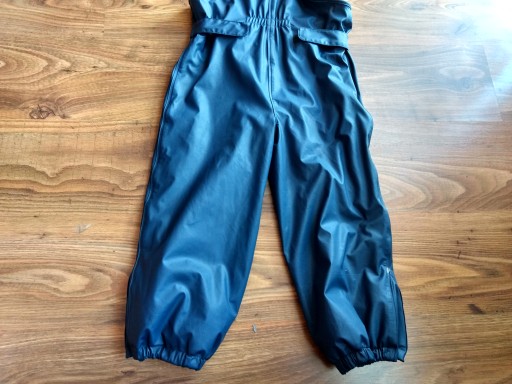 granatowe nieprzemakalne przeciwdeszczowe i przeciwśniegowe spodnie wewnątrz ocieplane polarem na regulowanych szelkach z gumy z klamrami zatrzaskowymi w pasie po bokach paski z rzepami regulujące szerokość dół nogawek ściągany gumą dodatkowo napy ułatwiające zakładanie stan dobry- otarcie na kolanie widoczne na zdjęciach wymiary szer w pasie -39 cm dł bez szelek-85 cm dł nogawki od kroku-46 cm rozmiar z metki to 4 ale pasują i na starsze dziecko