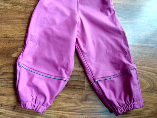 różowe nieprzemakalne przeciwdeszczowe i przeciwśniegowe spodnie na regulowanych szelkach z gumy z klamrami zatrzaskowymi po bokach w pasie ściągane gumą dół nogawek ściągany gumą napy ułatwiające zakładanie stan bdb- spodnie noszą minimalne ślady użytkowania- widoczne na zdjęciach wymiary szer w pasie -31 cm dł bez szelek-67 cm dł nogawki od kroku-36 cm