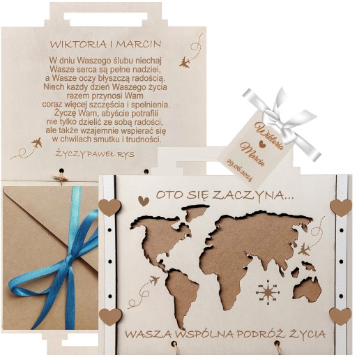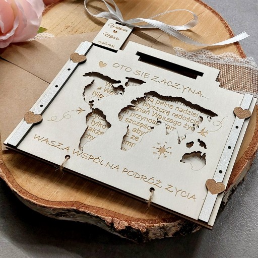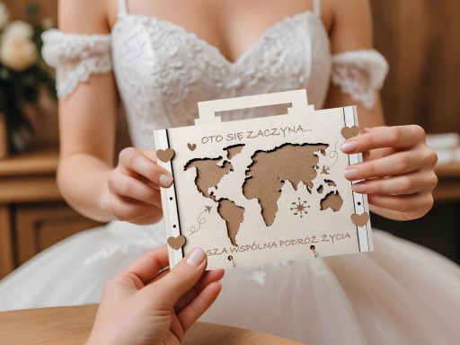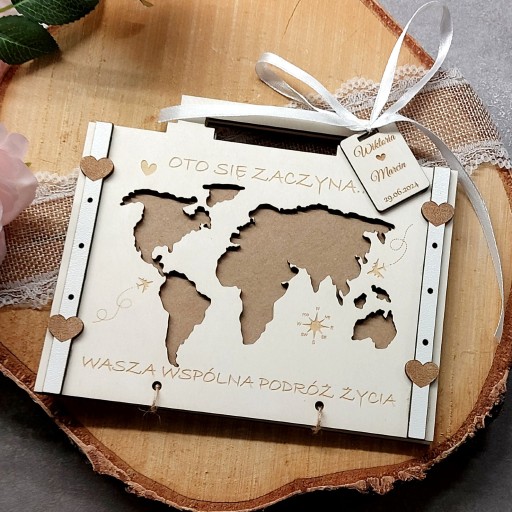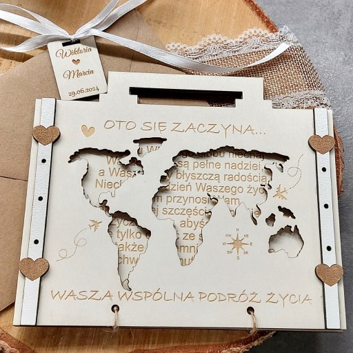 Elegancka drewniana walizka wykonana jest z wysokiej jakości naturalnego drewna (sklejka 3mm). Jest wycinana laserem, a następnie ręcznie szlifowana. Okładka kartki posiada wyciętą mapę oraz białe wypukłe elementy z serduszkami. Wewnątrz walizki znajduje się koperta, do której możesz wsadzić banknoty, vouchery czy też bilet lotniczy na wykupioną podróż poślubną! W środku znajdują się również wygrawerowane życzenia i podpis z pełną personalizacją. Walizka świetnie sprawdzi się też jako prezent na rocznicę ślubu !