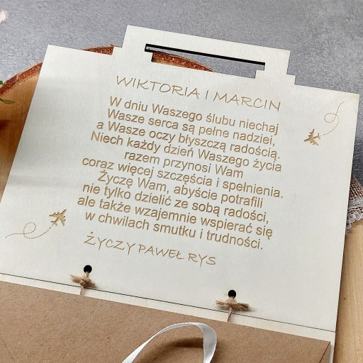 DREWNIANA KARTKA WALIZKA NA ŚLUB NA PIENIĄDZE PREZENT ŚLUBNY DLA PARY MŁODEJ Z GRAWEREM