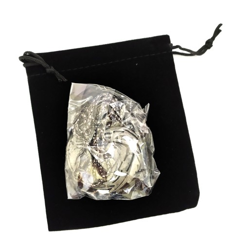 Średnica wisiorka 5.0 cm, a długość łańcucha 60 cm, waga 48 g.
