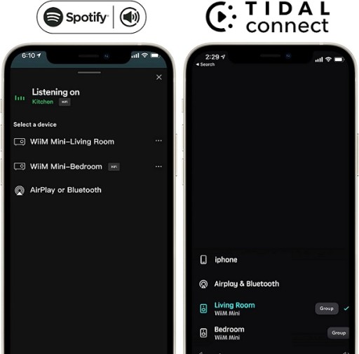 Użyj aplikacji Spotify lub TIDAL jako pilota, aby sterować systemem dźwiękowym WiiM Mini i bezpośrednio przesyłać strumieniowo z tych usług. WiiM Mini zapewnia znacznie większy zasięg działania niż tradycyjny odbiornik Bluetooth lub AirPlay 2 i uwalnia Twoje urządzenie mobilne do innych zadań. W przypadku Spotify działa zarówno dla użytkowników Spotify Free, jak i Premium.