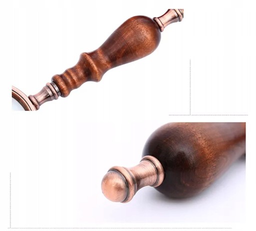 Materiał: stop cynku, miedź, soczewka ze szkła optycznego i drewniany uchwyt;