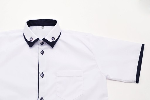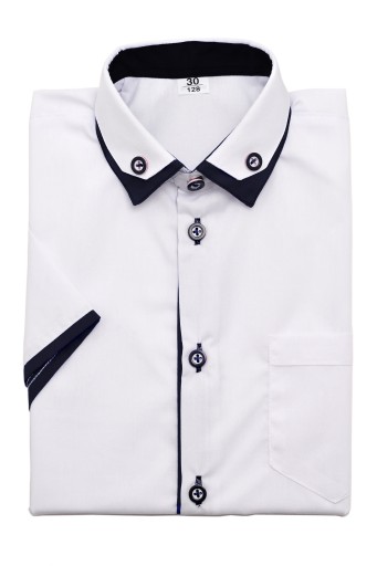 Elegancka koszula chłopięca z krótkim rękawem. Posiada kieszonkę z przodu po lewej stronie oraz podwójny kołnierzyk. Idealnie nadaje się na wszelkiego rodzaju uroczystości szkolne, kościelne czy rodzinne.