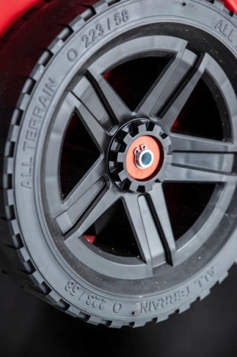 - Dużo większe koła (22,3 cm średnicy) pokryte grubą warstwą gumy zapewniają doskonałą i cichą trakcję nawet w bardzo trudnych warunkach terenowych.