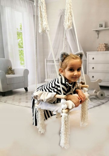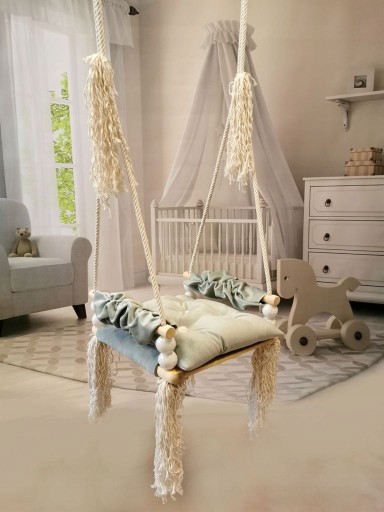 Huśtawka wykonana z delikatnego aksamitno pluszowego materiału, który jest bardzo miękki i delikatny w dotyku oraz bardzo wytrzymały.
