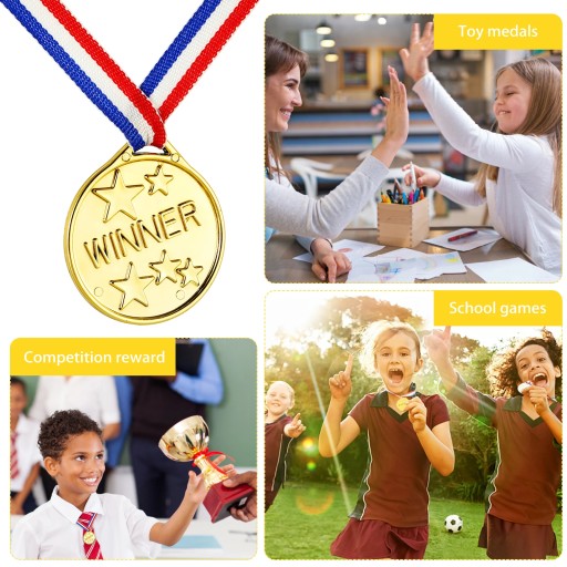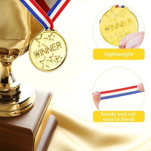 Cechy Kolor: jak pokazano Materiał: tworzywo sztuczne Rozmiar: 4.40X3.80X0.40cm/1.73X1.49X0.16in Szeroka kompatybilność: Wstążka ma około 28 cm, odpowiednia dla dziecka powyżej 3 lat, jest przyjazna dla dzieci i przyjazna dla skóry, dzięki czemu są bardzo wygodne dla dzieci. Wystarczająca ilość: Otrzymasz dużą ilość złotych nagród imprezowych ze wstążką, wystarczającą do zaspokojenia różnych potrzeb, które mogą mieć zastosowanie na imprezach, festiwalach, grach na świeżym powietrzu itp. Unikalny projekt: różne wzory z przodu iz tyłu, dzieci pokochają medale zwycięzców z wytłoczonym „zwycięzcą” z przodu i wzorami gwiazd iz tyłu. Szerokie zastosowanie: dla zwycięzcy medal jest bardzo dobrą nagrodą, reprezentuje twoje wysiłki i sukces. Doskonały wybór do gier towarzyskich, pokazów talentów, sztafet, gier szkolnych, festiwali itp. Znacząca nagroda: możesz użyć tych plastikowych medali, aby nagrodzić swoje dzieci i zachęcić je do poświęcenia wysiłków, aby ścigać swoje marzenia, znaczącą nagrodę dla dzieci.