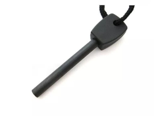 Krzesiwo i blaszka są połączone sznurkiem, co daje możliwość zawieszenia na smyczy, jako brelok lub pętlę nadgarstkową.