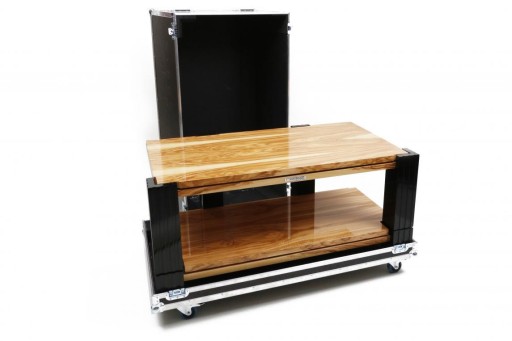 Stolik modułowy, czteronożny, dwupoziomowy z blatami o strukturze wielowarstwowej, pokrytymi fornirem drewnianym (w prezentowanej wersji jest to drewno z drzewa oliwnego, wysoki połysk) oraz litymi nogami o strukturze wielowarstwowej (w prezentowanej wersji lakierowanymi na czarny wysoki połysk fortepianowy). Podwójne blaty są od siebie odseparowane przez układ BBS - system łączący zalety punktowego podparcia na kolcu (minimalna powierzchnia styku sprawia, że energia kinetyczna drgań pionowych jest wytracana poprzez zamianę na ciepło) z efektywnym tłumieniem drgań poprzecznych i ukośnych na skutek działania trzech rodzajów ruchu w jednym czasie: wahadłowego, toczenia i ślizgowego. Konstrukcja stolika składa się z dwóch osobnych modułów. Każdy moduł odseparowany jest od innych za pomocą regulowanych stożków antywibracyjnych. Istnieje możliwość dalszej rozbudowy stolika o kolejne moduły.