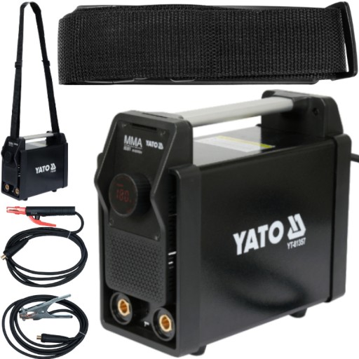 - Zawartość zestawu: spawarka, uchwyt masowy 300 A, 3 m (16 mm2), uchwyt elektrodowy 200 A, 3 m (16 mm2), przewód zasilający 2.5 m, pasek naramienny;