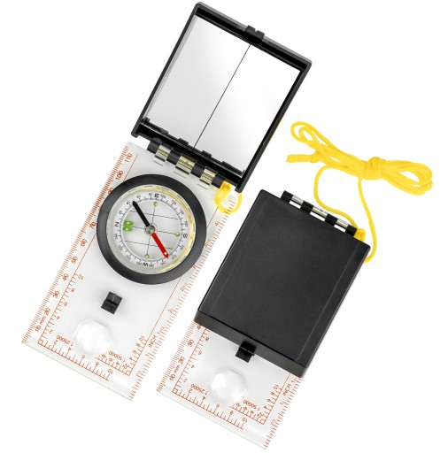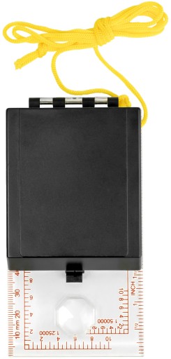 Kompas mapowy z dokładną podziałką. Na płytce podziałka i szkło powiększające. Klapka zabezpieczająca posiada wewnętrzne lusterko ułatwiające pracę na mapie.