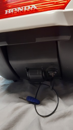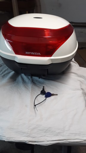 Witam! W ofercie mam oryginalny kompletny kufer centralny top box Honda pojemność 35 litrów. Kufer biały, całość w bdb stanie, kilka drobnych rys, bez pęknięć głębokich rys, przetarć itp Jedyny minus to podklejone mocowanie odblasku w jednym miejscu - jak na foto. W komplecie kufer, dwa kluczyki do zamka. Kufer pasuje do wielu motocykli Honda np: SH 125, Sh 300, PCX 125, CBF 1000, CB 500 X. Mam taki sam zamontowany na CBR 1100 XX - ostatnie zdjęcie. Mam też taki kufer z zieloną, niebieską i brązową pokrywą (nowe - leżaki magazynowe),