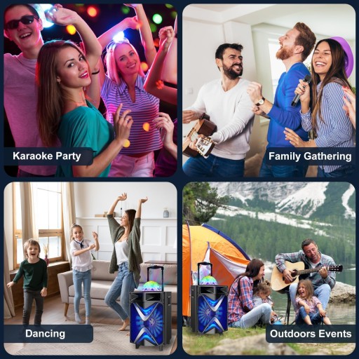 - Kolorowe diody LED DISCO: Kolorowe światła pasują do muzyki, tworząc dla Ciebie najlepszą atmosferę karaoke. 2 bezprzewodowe mikrofony UHF pomagają pozbyć się splątanych przewodów, zapewniając bardziej stabilny sygnał i dłuższą transmisję odległości (do 65 stóp).