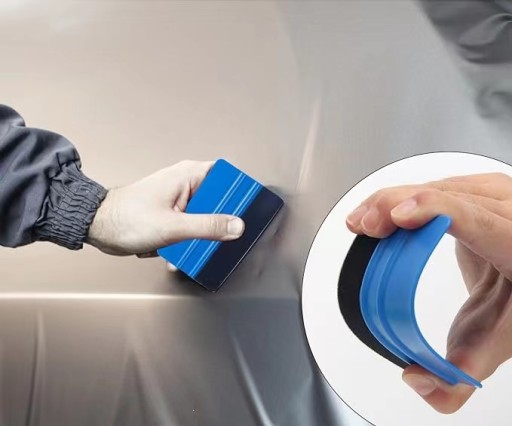 - Mini rakla różowa - która służy do wyciskania pozostałości wody i brudu z pod folii oraz dociskania jej w mało dostępnych miejscach. Możemy nią również usunąć stare naklejki
