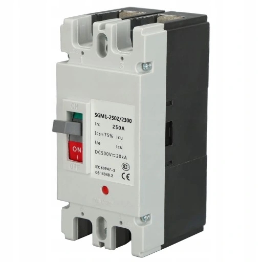 - <h2>Specyfikacja:</h2><ul><li>Typ artykułu: wyłącznik automatyczny</li><li>Model: SGM1-250Z/2300</li><li>Materiał: tworzywo termoutwardzalne BMC.</li><li>Prąd znamionowy: 250A</li><li>Napięcie znamionowe (Ue): DC 500 V</li><li>Zdolność zrywania: 20KA</li><li>Zalecana metoda instalacji (2P): okablowanie pionowe, wejście od góry i wyjście od dołu.</li></ul>. Wyłącznik obwodu 2P MCCB Solar Battery Protection