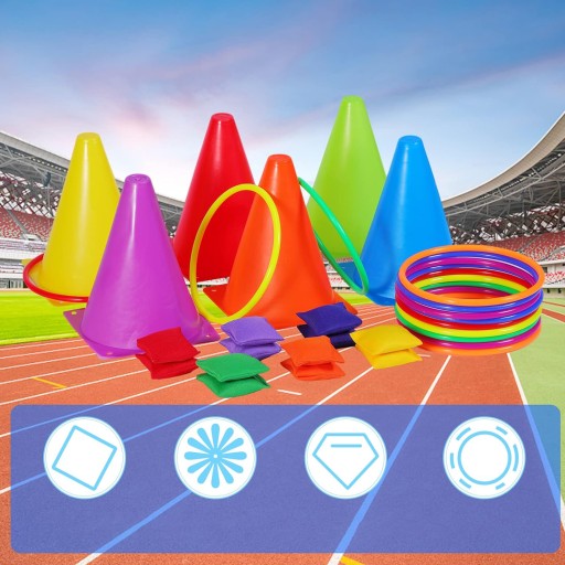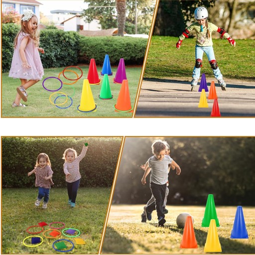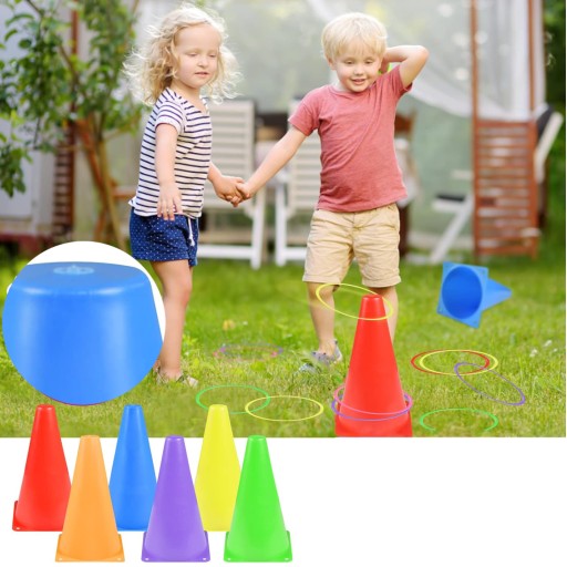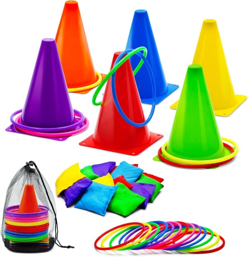 💖Zręcznościowy zestaw imprezowy 3 w 1: w tym 6 sztuk pachołków drogowych, 12 sztuk kolorowych pierścieni i 12 sztuk woreczków z fasolą. Idealny zestaw Zręcznościowy dla wszystkich grup wiekowych.