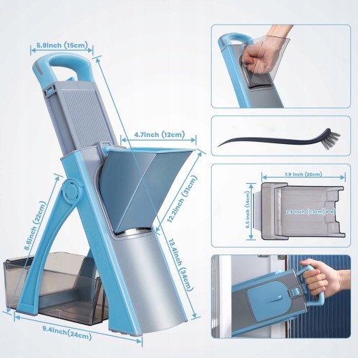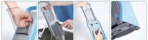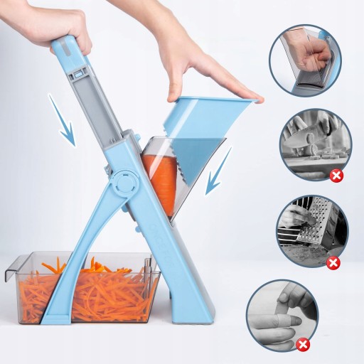 Skorupa krajalnicy do warzyw wykonana jest z ekologicznego ABS z wbudowanymi ostrzami ze stali nierdzewnej odpornej na rdzę, bez konieczności wymiany ostrzy, powiększonej antypoślizgowej podstawy silikonowej, a statyw jest zaprojektowany tak, aby działał bardziej stabilnie .