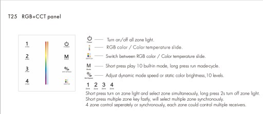 - Każda strefa może zdalnie sterować wieloma kontrolerami LED RF 2.4G.