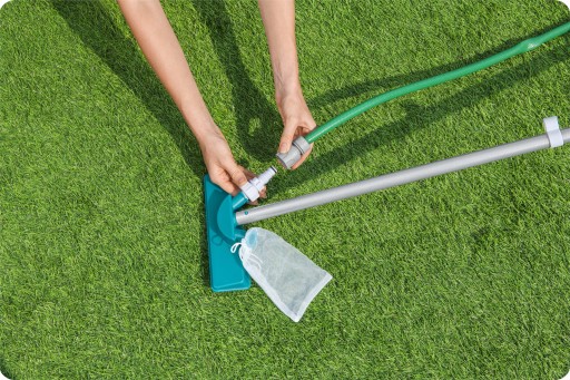 Ten podstawowy zestaw czyszczący jest niezbędny jeśli pragniesz utrzymać zbiornik basenowy w czystości. Składa się z regulowanego, teleskopowego kija (rączki), do której można przyłączyć jedną z dwóch końcówek: siatkę do wyławiania nieczystości lub końcówkę odkurzacza, która poprzez podciśnienie (po podłączeniu do węża ogrodowego) wytwarza wir, który sprawia, że zanieczyszczenia zbieranie z dna zbiornika trafiają do małej siateczki.