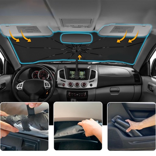 Podobnie jak parasol, nasza osłona przeciwsłoneczna jest łatwa w montażu i składaniu, co można zrobić w kilka sekund. Dzięki kompaktowemu skórzanemu pokrowcowi, osłona na deskę rozdzielczą może zmieścić się w kieszeniach drzwi samochodu lub w schowku.