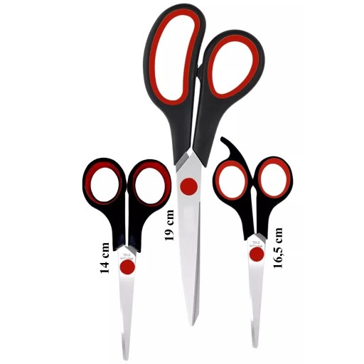 W zestawie nożyczki w rozmiarach 19 cm, 16,5 cm i 14 cm.