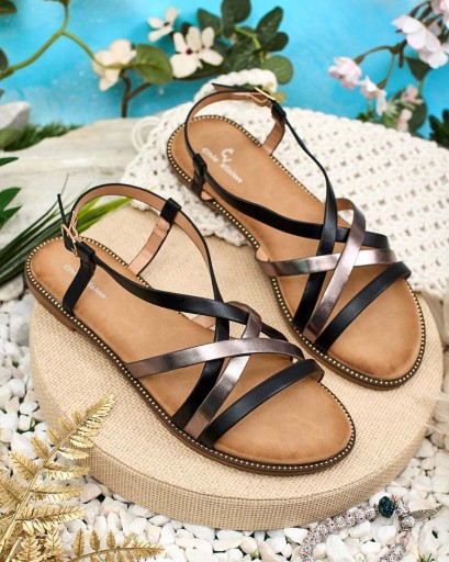 Damskie sandałki na płaskiej podeszwie - to idealny pomysł na gorące letnie dni. Paseczki wykonane ze skóry ekologicznej, zaś wkładka to skóra ekologiczna matowa. Model udekorowany ozdobnymi paseczkami.