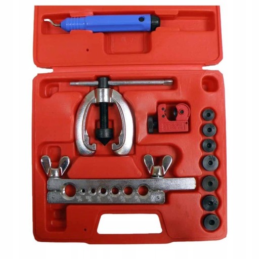 Zestaw przeznaczony do ręcznego rozszerzania rurek, wykonywania stożkowych kołnierzy o kącie 90 ° Obrabianą rurkę mocujemy w odpowiednim otworze matrycy i rozciągamy za pomocą wkręcanego stożka. Do wykorzystania przy wykonywaniu instalacji grzewczych, klimatyzacyjnych, hamulcowych.
