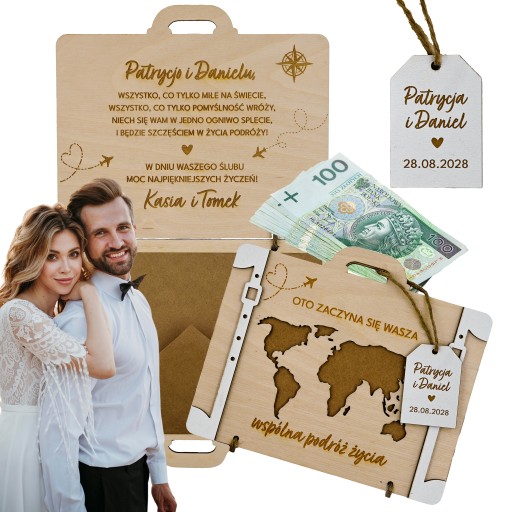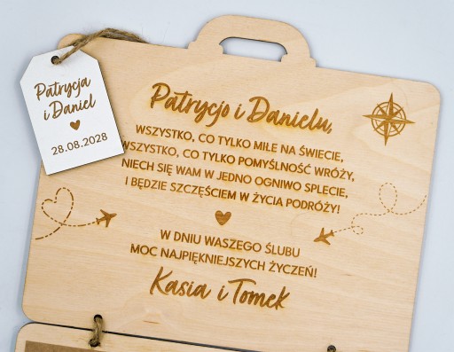✨DREWNIANA KARTKA WALIZKA NA ŚLUB NA PIENIĄDZE PREZENT ŚLUBNY DLA PARY MŁODEJ Z GRAWEREM - PERSONALIZACJA! ✨
