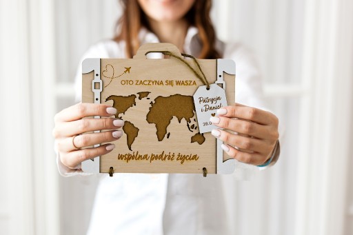 Drewniane walizka w naturalnym wydaniu posiada piękne grafiki i spersonalizowane teksty. Pozwoli wręczyć pieniądze na podróż dookoła świata. Pamiątka jest świetnym wyborem dla Nowożeńców, by ich zaskoczyć i sprawić radość.