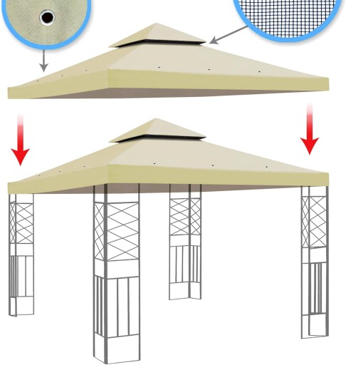 KONSTRUKCJA: dwupoziomowy dach zadaszenia altany pozwala na szybkie przenikanie wiatru i dymu z grilla oraz skutecznie zmniejsza uszkodzenia stabilności górnej części zadaszenia przy silnej wietrznej pogodzie. Górny poziom posiada moskitierę, która chroni przed komarami.