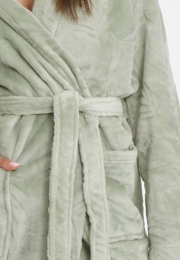 Damski szlafrok marki Henderson Ladies to niezwykle przyjemna w dotyku propozycja, która sprzyja relaksowi. Jednocześnie zapewnia wygodę – dzięki kapturowi i kieszeniom, a także pasowi do regulacji. Narzutkę kąpielową wyróżniają też delikatny miętowy kolor i wytłoczenia w kształcie liści. Szlafrok ten otuli Twoją skórę i rozpieści zmysły!