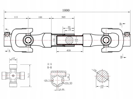 - Przeguby krzyżakowe: 27 x 74.5 mm