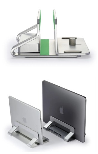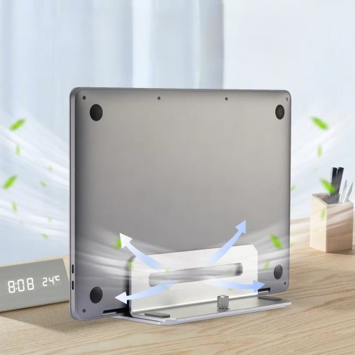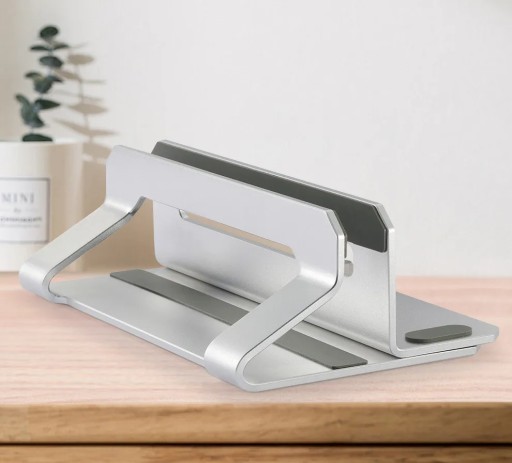 Stojak pomaga utrzymać porządek na biurku, umożliwiając ustawienie laptopa w pozycji pionowej.