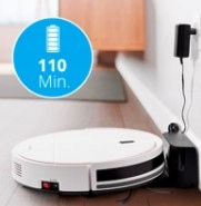 - Twój nowy robot jest szczególnie wydajny i czyści do 110 minut na jednym ładowaniu akumulatora, zanim będzie potrzebna przerwa na ładowanie. Najważniejsze: pomoc domowa samodzielnie jedzie do stacji ładującej, więc naprawdę nie musisz się o nic martwić.