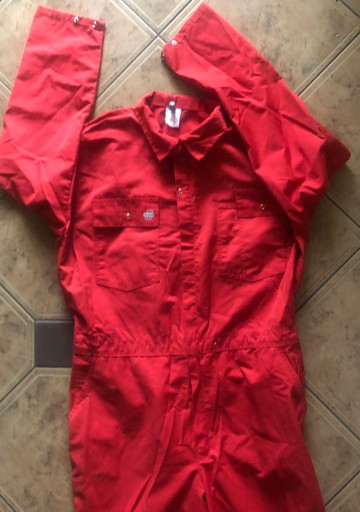 Kombinezon jest w stanie bardzo dobrym,wg mnie idealnym.Wg metki KLOPMAN rozmiar 56,a materiał to 35%bawełna+ 65%poliester .Kombinezon zapinany na suwak obejmujący rozporek i listwa kryjąca suwak zapinana u góry na napy. Podaję wymiary;długość do pasa-50cm,długość nogawki zewnętrzna z pasem-113cm,długość nogawki od kroku-81cm,szerokość w ramionach-50cm,długość rękawa-63cm,szerokość od pachy do pachy-64cmx2,szerokość w pasie bez rozciągania-51cmx2,po rozciągnięciu-57cmx2,szerokość nogawki na dole-24,5cm.Kieszenie z przodu na dole wpuszczane ukośne i pod nimi otwory dajace dostęp do wnętrza kombinezonu,u góry kieszenie naszywane z patkami zapinanymi na napy,a z tyłu kieszenie naszywane,obwód rękawa na dole można zmniejszyć zapinając napę.