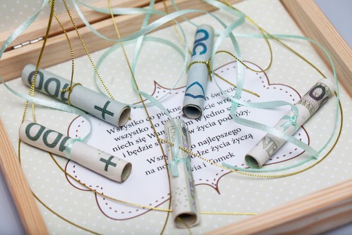 - Nie ma konieczności wiązania banknoty na każdej wstążce czy sznurku. Wystarczą 3 - 4 banknoty, aby uzyskać bardzo dekoracyjny efekt.