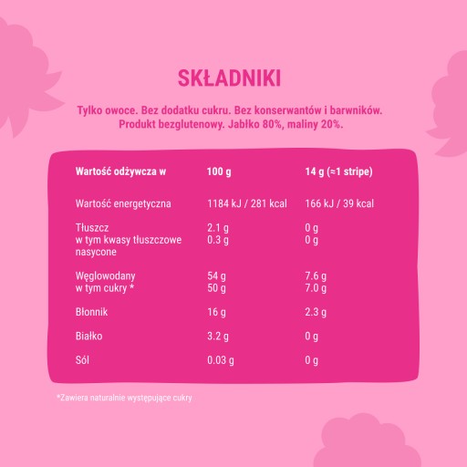 - Czysty skład. Stripesy mają w 100% naturalny skład. To tylko owoce i nic więcej! Zawsze są robione bez dodatku cukru, konserwantów i barwników. Są bezglutenowe i nie zawierają GMO.