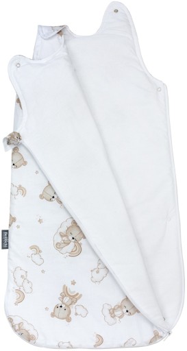 - wypełnienie: antyalergiczna włóknina o gramaturze 150g/m2, która sprawia, że śpiworek jest miękki, przytulny i cieplutki a jednocześnie zapewnia odpowiedni przepływ powietrza. Dzięki temu maluszek nie przegrzeje się podczas snu.
