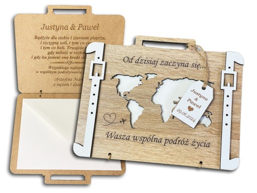 Piękne opakowanie w formie walizki z grawerem na pieniądze, zdjęcia, pamiątka ślubna.