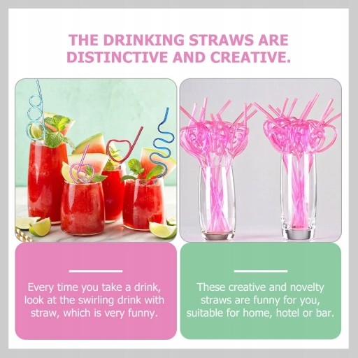 Słomki wykonane z tworzywa sztucznego, po czyszczeniu mogą być ponownie użyte. Różne wzory, zabawne słomki dodadzą koloru i stylu twoim napojom. Kiedy jesteś gotowy, aby ugasić pragnienie, te słomki do picia są idealne do koktajli mlecznych, a nawet butelek z napojami.