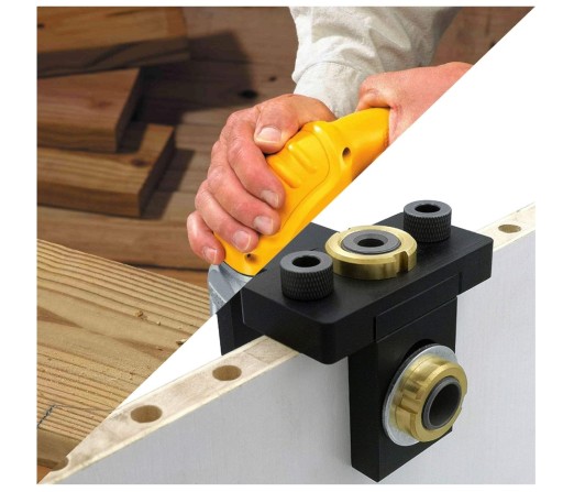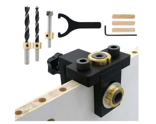 - Szablon 3 w 1 to szablon, który ułatwia wiercenie w drewnie, płycie wiórowej, MDF itp. Idealnie nadaje się do tworzenia połączeń mimośrodowych z użyciem kołków drewnianych, może też być użyty do wiercenia pionowego.